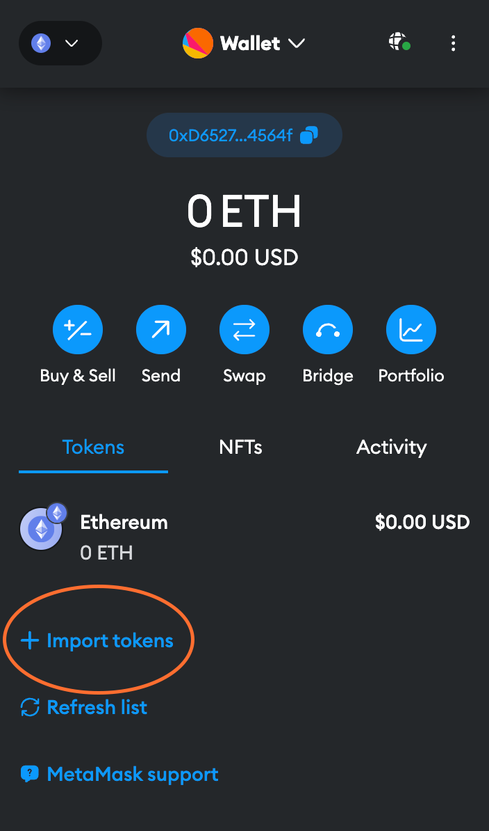 Finally, add the rETH token to MetaMask so you can see your balance and access it for trading. Click the Assets tab, then click Add Token: