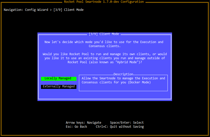 Locally Managed (also known as "Docker Mode") is the default choice. Use it if you don't already have a client pair and you want the Smartnode to manage one for you. By choosing this, the Smartnode will create, configure and manage an Execution & Consensus Client pair as Docker containers. Don't worry, you'll get to choose which client you want to run next.