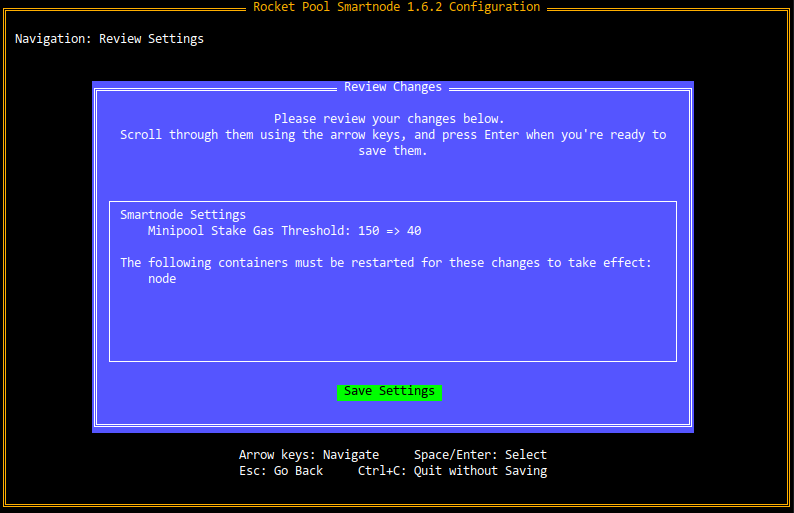As a reminder, nothing will be saved to disk until you go through the Review dialog via the Review Changes and Save button. You are encouraged to explore all of the settings to learn about them and see what your Smartnode can do!