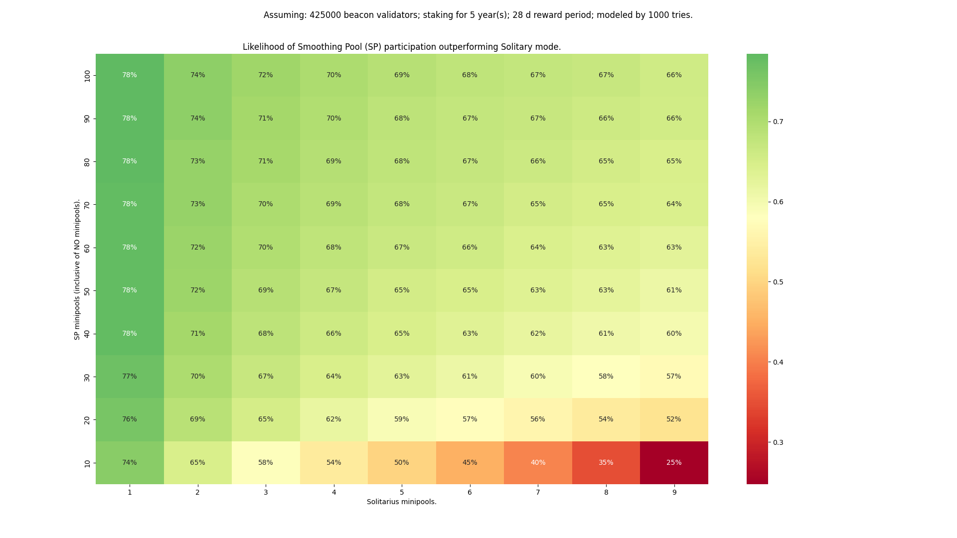 To make the math easy to understand, community member Ken Smith has put together a massive analysis comparing the profitability of the Smoothing Pool and the Fee Distributor, which is summarized nicely with this chart: