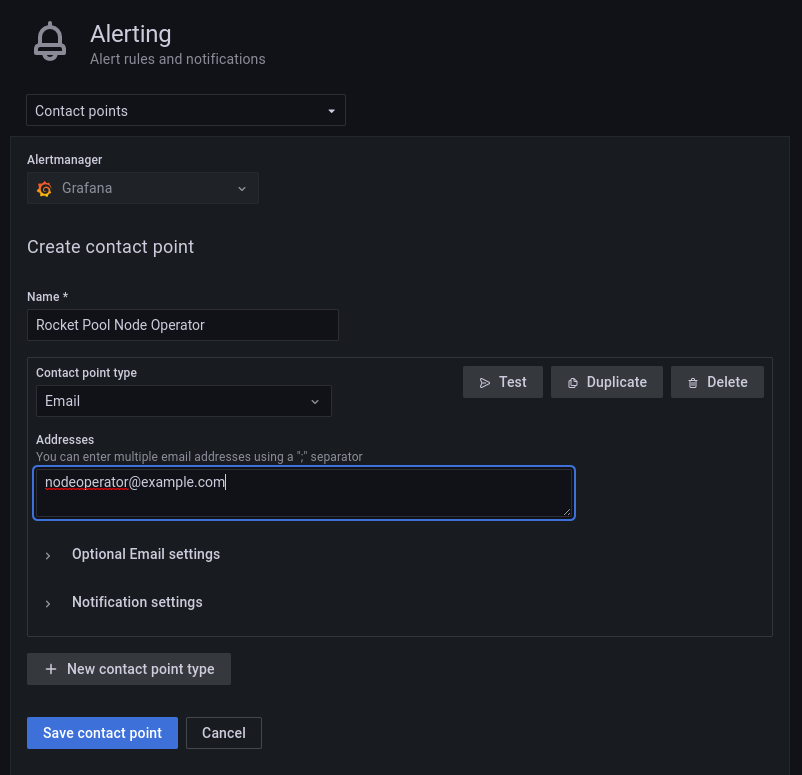 Click New contact point and select Email as the Contact point type. Enter an email address in the Addresses section and click Test.