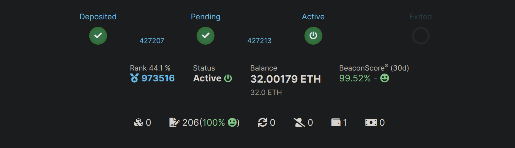 And there you have it! If you would like to deposit another validator, this credit is also redeemable as a validator deposit in addition to being redeemable as rETH. If you happen to have used an express queue ticket on your exited (dequeued) validator, your node will be refunded that express queue ticket.