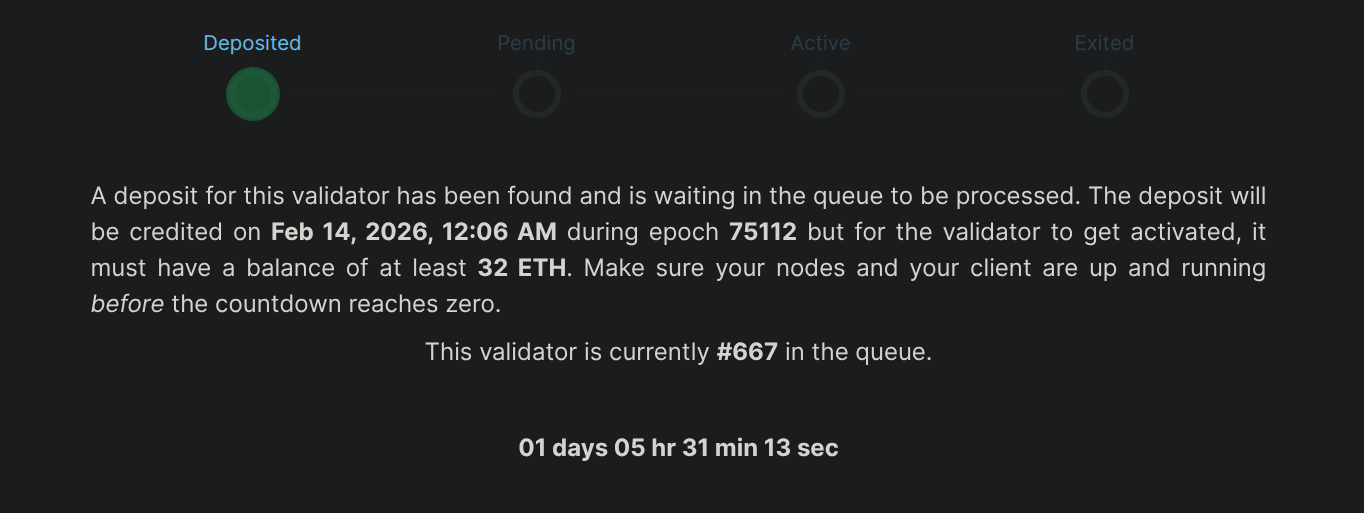The second is the Beacon Chain queue, which is managed by the Ethereum Beacon Chain & determines when your validator will become active. Please be aware that the time it takes for your validator to become active can vary greatly depending on your position in each queue & the current state of the network.