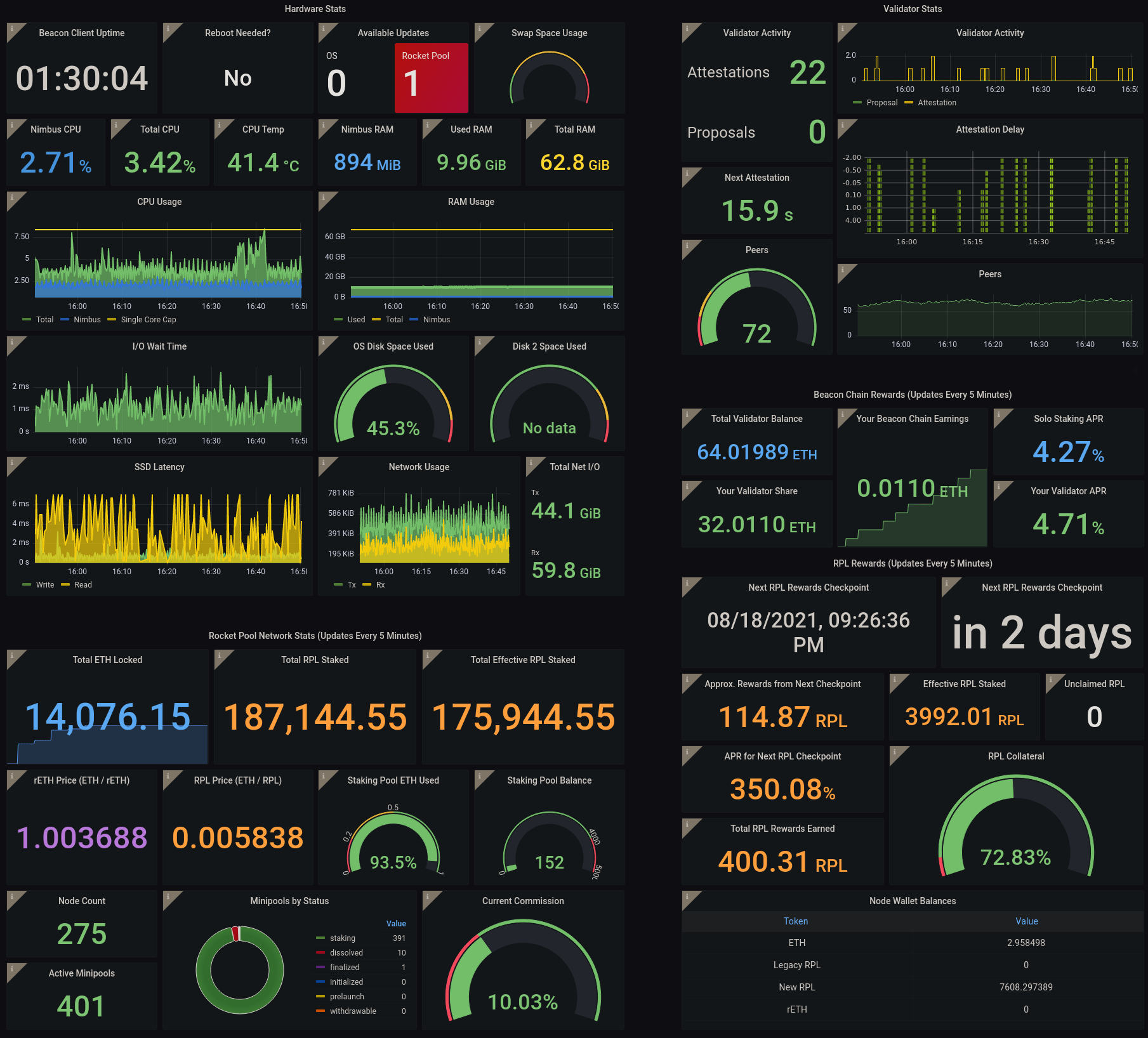 The Smartnode provides a convenient dashboard that allows you to monitor many of the metrics listed above. There is one dashboard for each Consensus Client. Below is an example of the dashboard for Nimbus: