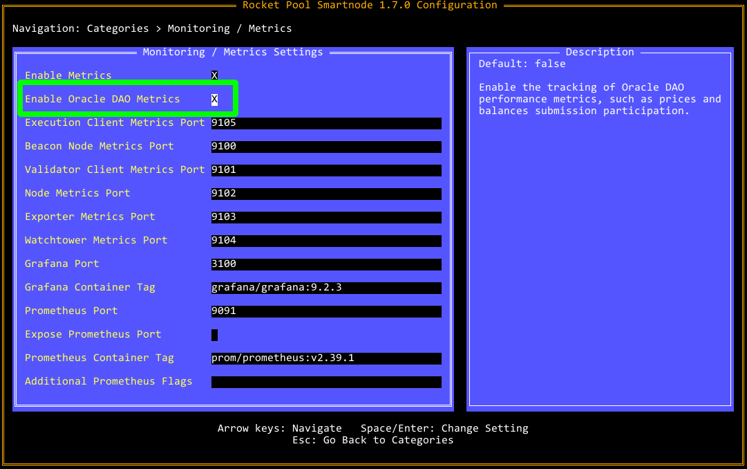 First, enable Oracle DAO metrics in the Metrics section of the rocketpool service config editor: