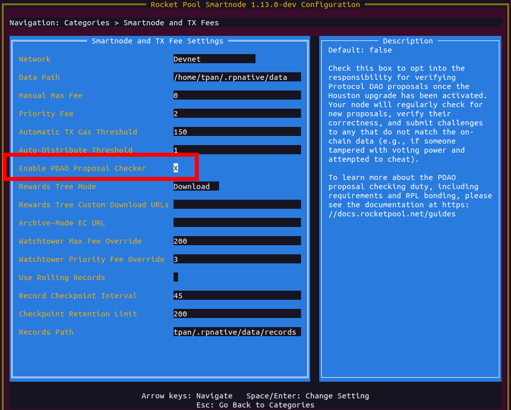 Any node can participate in tracking and verifying the correctness of proposals. To opt into this responsibility, use the command rocketpool service config, navigate to the Smartnode and TX Fee Settings menu, and check the box Enable PDAO Proposal Checker.