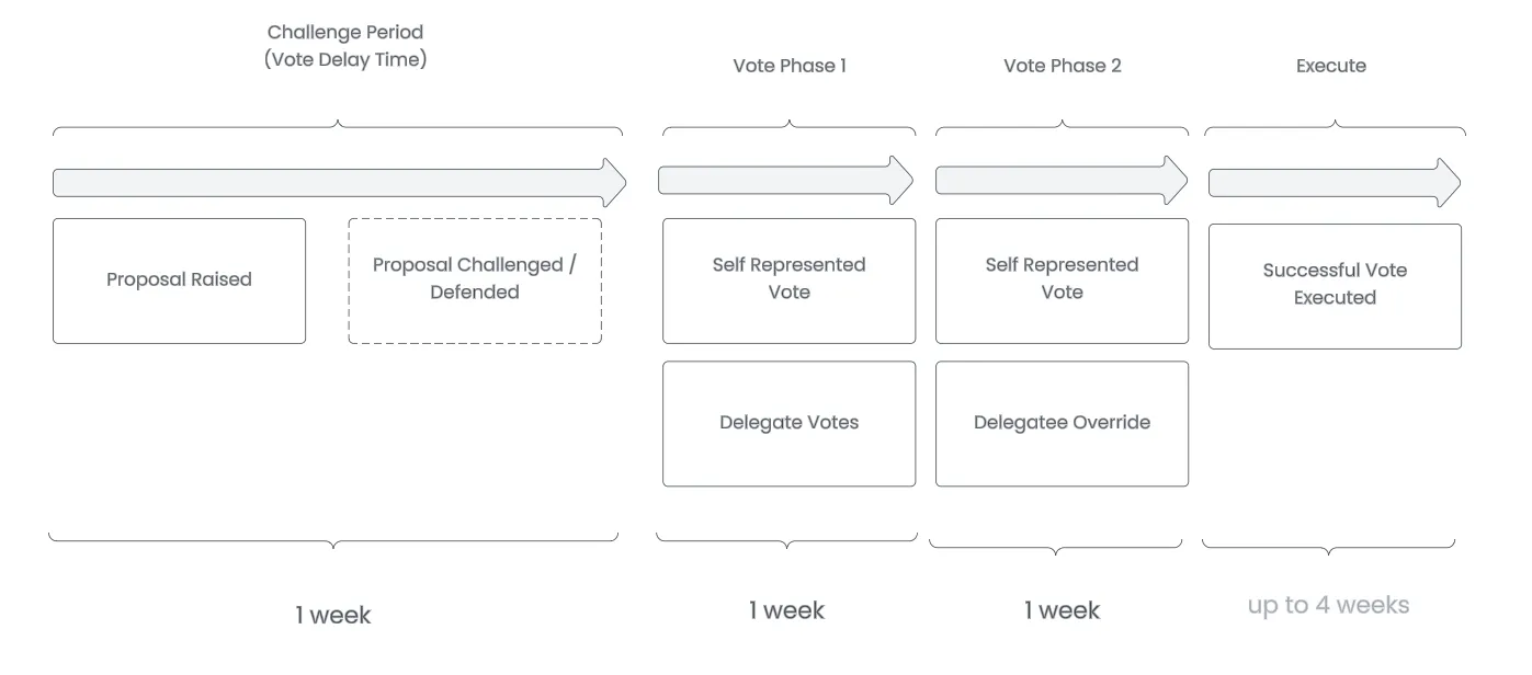 A proposal should be forecasted by the governance process before it ends up on-chain. It consists of 4 Periods, all of which are pDAO controllable parameters: